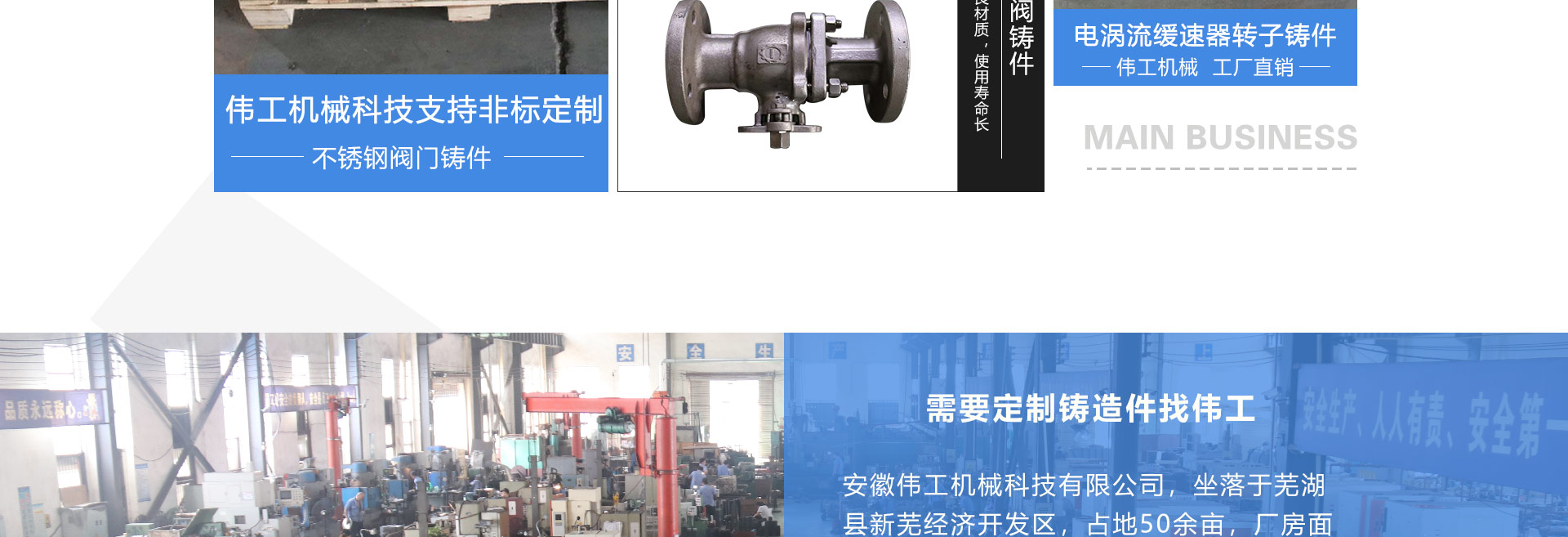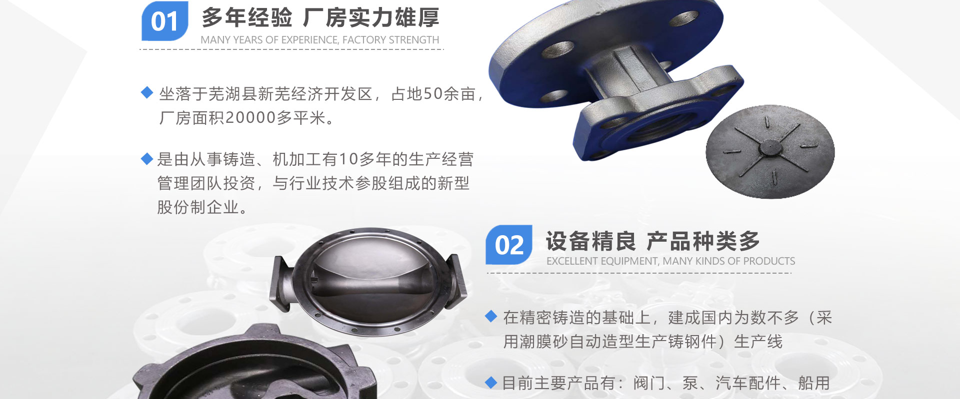 安徽偉工機(jī)械科技有限公司,坐落于安徽蕪湖新蕪經(jīng)濟(jì)開發(fā)區(qū),是一家専業(yè)從事鑄造產(chǎn)品設(shè)計(jì)、研發(fā)、生產(chǎn)、銷售于一體的企業(yè),公司為客戶的產(chǎn)品提供多樣的技術(shù)支持與設(shè)計(jì),公司主要鑄造技術(shù)有潮模砂鑄造、硅溶膠精鑄工藝。主要產(chǎn)品有:不銹鋼閥門配件、泵閥配件、汽車配件、工業(yè)管道配件、工程機(jī)械配件、汽車配件等。材質(zhì)為:低合金鋼、304、316、316L、鉻鉬鋼、哈氏合金、碳鋼、雙相鋼等。公司已先后通過ISO9001和TS16949等多種體系審核,以完備的管理手段和齊全的檢測設(shè)備滿足客戶需求,進(jìn)的設(shè)備,専業(yè)的技術(shù),嚴(yán)謹(jǐn)?shù)墓芾?,穩(wěn)定的質(zhì)量。服務(wù)客戶,鑄造未來,偉工誠摯的歡迎新老客戶共同商洽合作